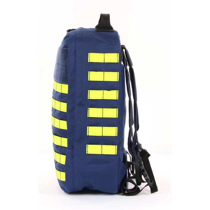 Der Rettungsrucksack kann trotz der schmalen Bauweise in Verbindung mit den Seitentaschen HVO horizontal und HVO vertikal das geforderte Material nach DIN 13155 aufnehmen.