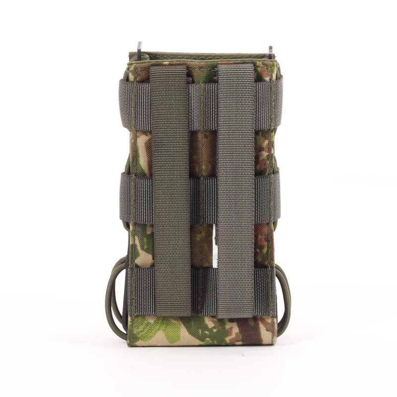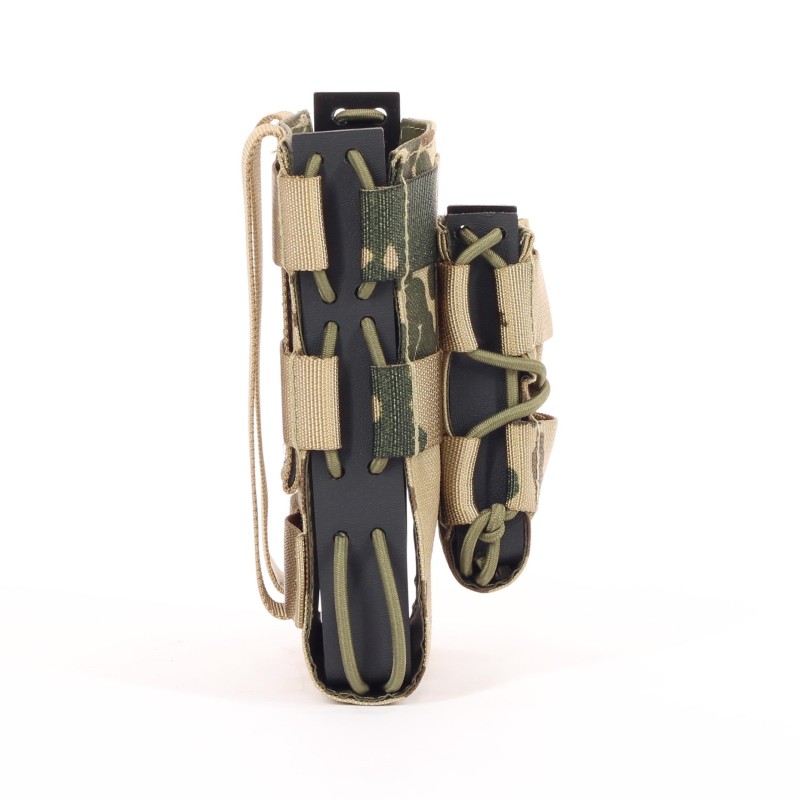 La bolsa de extracción rápida G36 Duo de nuestra serie Artemis es una combinación de una bolsa de revista para una pistola larga con una bolsa de revista para una pistola de mano. Esto le da al usuario la oportunidad de cambiar rápidamente de un arma a otra e intercambiar la revista. Para asegurar una sujeción segura de la bolsa de pistola súper rápida, está cosida firmemente en el bolsillo trasero. Al igual que con las bolsas individuales de extracción rápida, ambas tienen un perfil Kydex®, que permite una alta estabilidad dimensional y velocidad de dibujo. Los componentes plásticos y textiles están conectados con cables de goma resistentes y, por lo tanto, le dan a las bolsas una flexibilidad única.