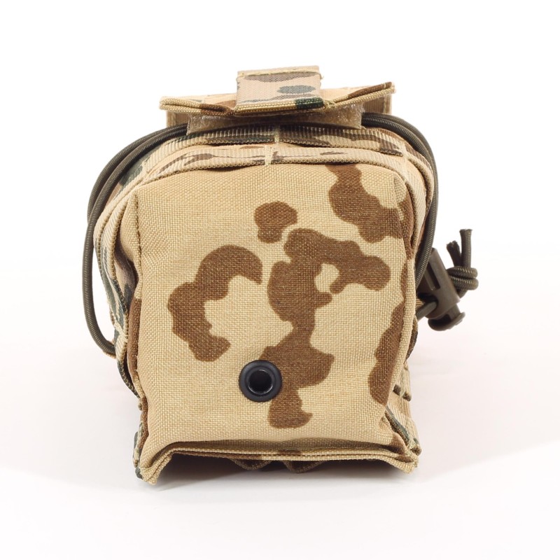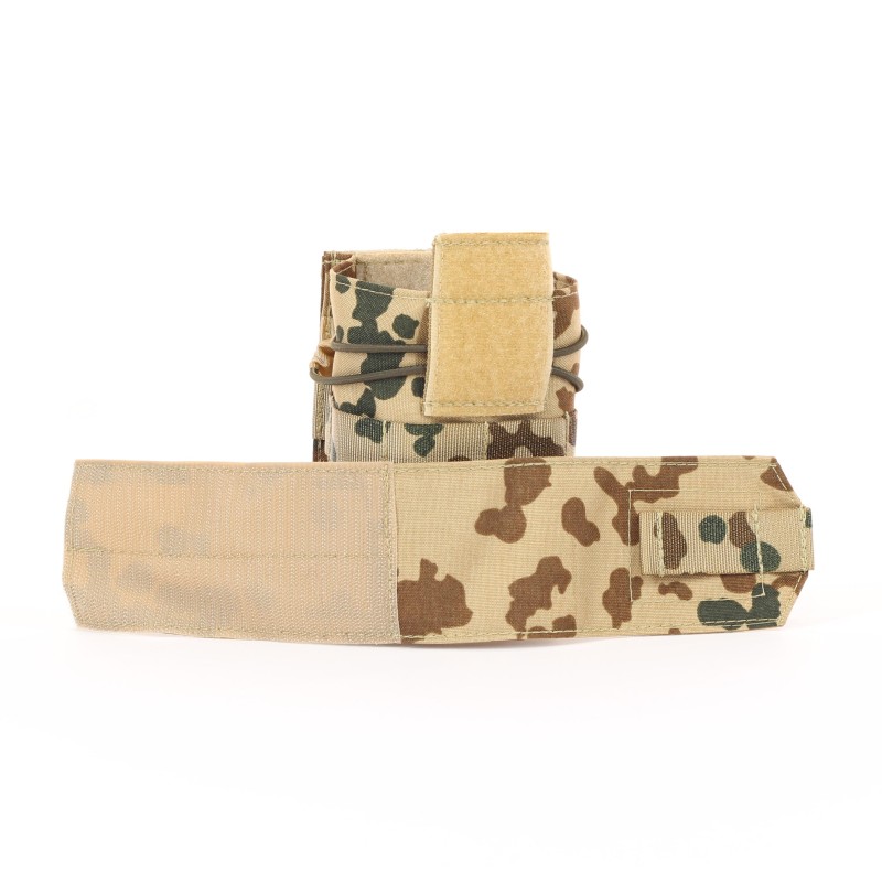 Le rabat de l'étui peut être facilement fixé ou retiré à l'aide de surfaces Velcro pour s'adapter aux chargeurs utilisés. Un dispositif d'aide à la traction facilite l'ouverture du rabat, même avec des gants. Des boucles MOLLE sont prévues à la fois sur le côté et sur le devant du sac pour y attacher des poches supplémentaires, comme la poche pour chargeur de pistolet Multi ou le sac de largage.