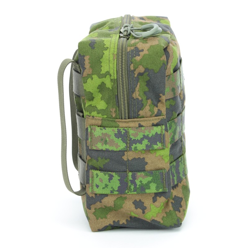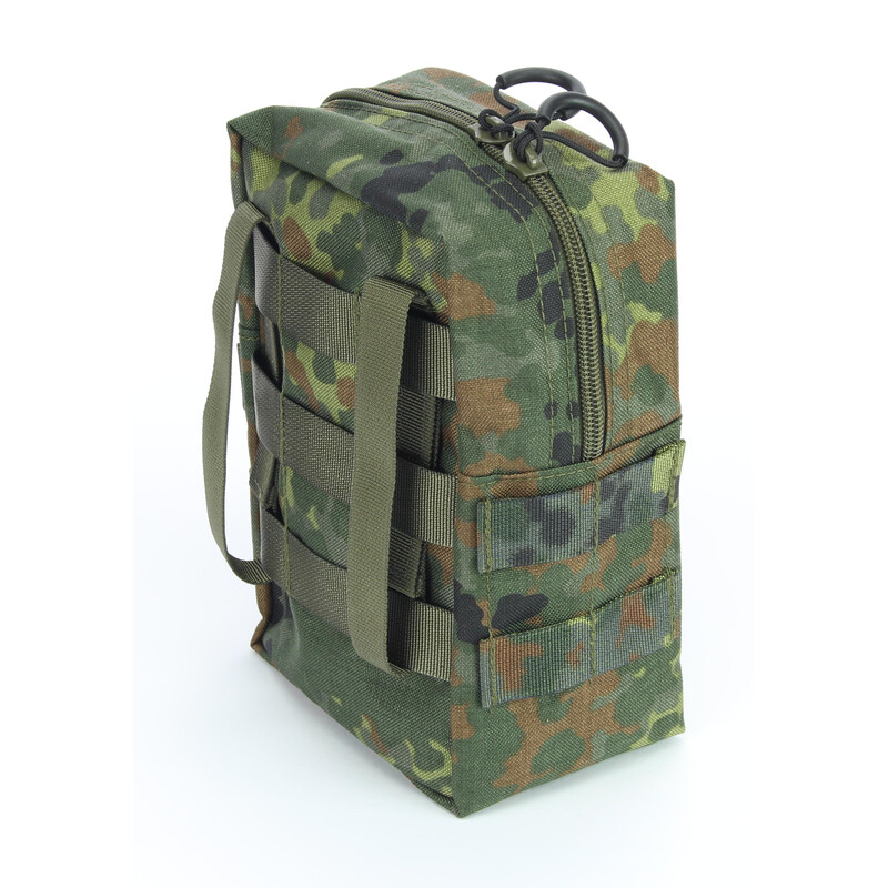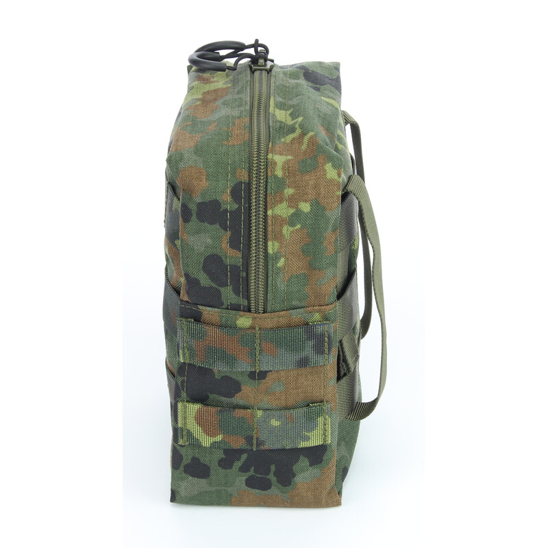 Il y a 2x3 boucles MOLLE à l'avant pour attacher des poches polyvalentes de petite et moyenne taille, comme la poche polyvalente Quadro. En outre, d'autres poches ou équipements peuvent être attachés aux boucles MOLLE sur le côté. Un œillet de drainage de l'eau se trouve sur le fond.